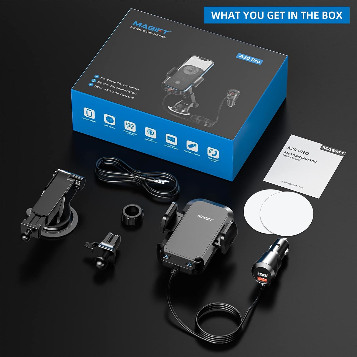 Experience an upgraded way of listening to your music and charging your devices on the go with the Magift Bluetooth 5.3 FM Transmitter Car Adapter. This versatile car accessory is compatible with all smartphones and effectively combines four devices into one compact gadget – a Bluetooth FM Transmitter, Dual USB car charger, Phone Holder, and an MP3 player. Car journeys will become more enjoyable for everyone on board with Magift! Key Features: 1. Bluetooth 5.3 FM Transmitter: Take hands-free calls and stream music directly from your smartphone via improved, stable Bluetooth 5.3 connection. The device automatically connects to the last paired device, helping you enjoy your favorite music instantly. 2. Dual USB Car Charger: No more fussing over device charging. With our device’s two USB ports, you can simultaneously charge two devices at an optimum speed. Never be without power for your important gadgets. 3. Phone Holder: The car adapter also comes with a built-in smartphone holder, adding to your driving convenience. You can use it for easy navigation or control of your music, without the need to juggle your device around dangerously. 4. MP3 Player: It also supports playing music from a TF card or USB Disk, offering you multiple ways to enjoy your personal music playlist on the go. 5. Wide Compatibility: Whether you are an iPhone fanatic, an Android enthusiast, or an avid user of any other smartphone, our FM Transmitter Car Adapter ensures seamless compatibility. Now, let nothing hold you back from enjoying music and staying connected while driving. 6. User-friendly Design: With its compact design and simple operation, you can enjoy a hassle-free experience. Its LCD screen displays information like voltage, volume, FM frequency, and the name of the song. Get the Magift Bluetooth 5.3 FM Transmitter Car Adapter and turn your vehicle into a mini-concert hall while staying powered-up for all your journeys!