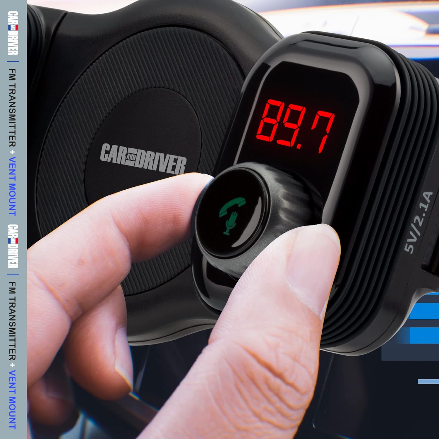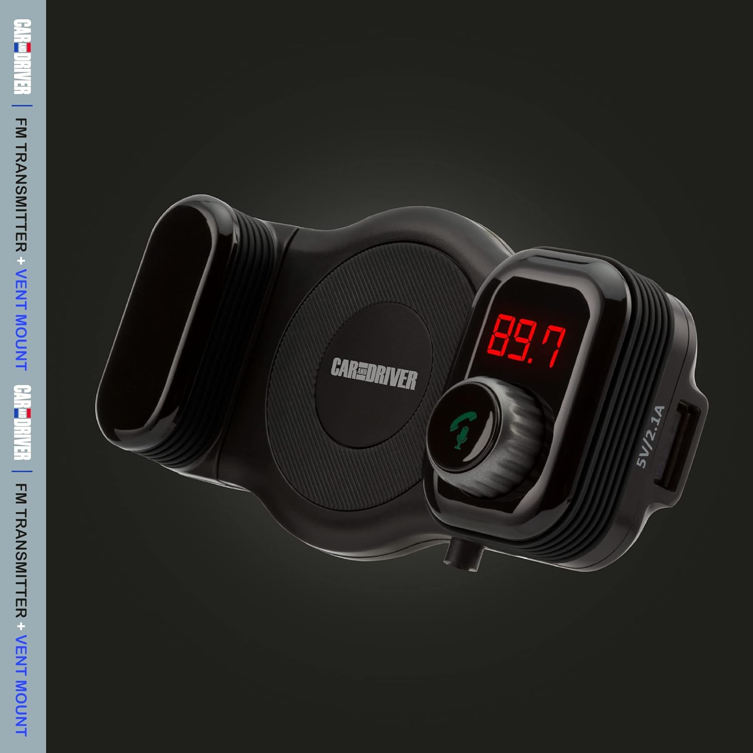 Car and Driver Bluetooth FM Transmitter | Car Vent Phone Mount featuring Streaming Audio, TF Card Slot, Hands-Free Calling, USB Charging, Siri Compatible, Secure Grip, Universal Fit