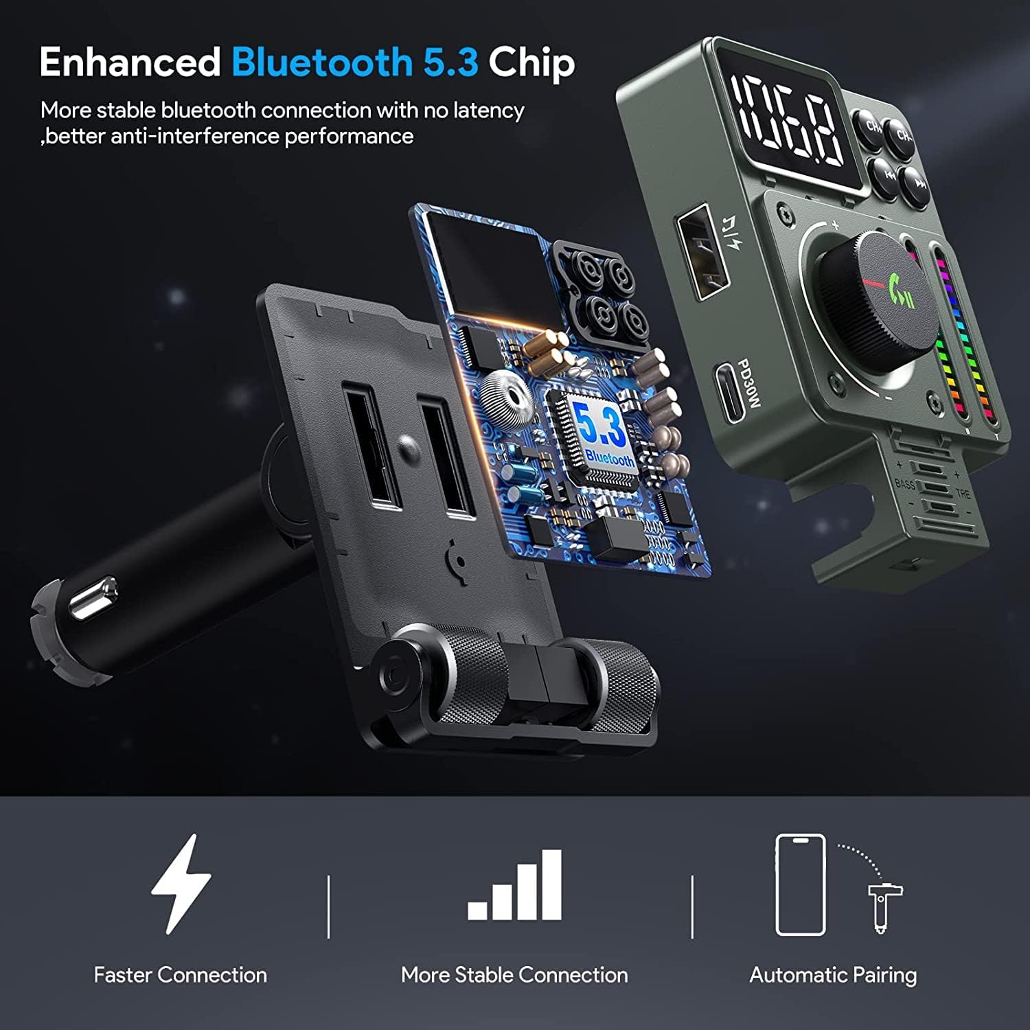 LENCENT FM Bluetooth 5.3 Transmitter for Car, Adjustable Treble and Bass Sound Music Player, Bluetooth Car Adapter for Hands Free Calls, Supports PD30W Fast Charging, U Disk, Siri Google Assistant